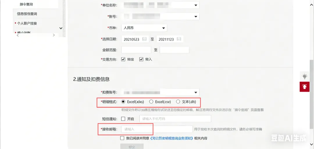2. 下拉选择需要下载的时间段、明细格式,填写接收邮箱后提交-2小时后登录邮箱下载