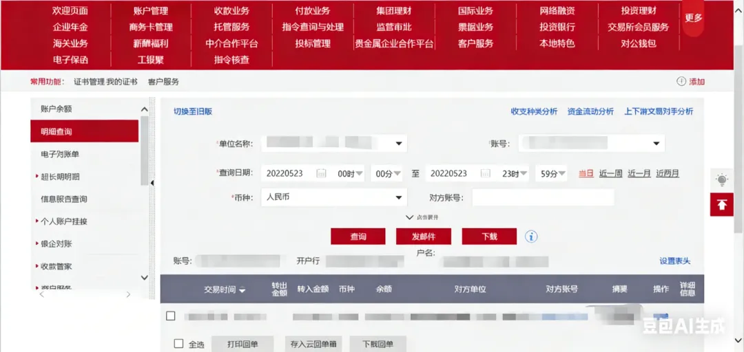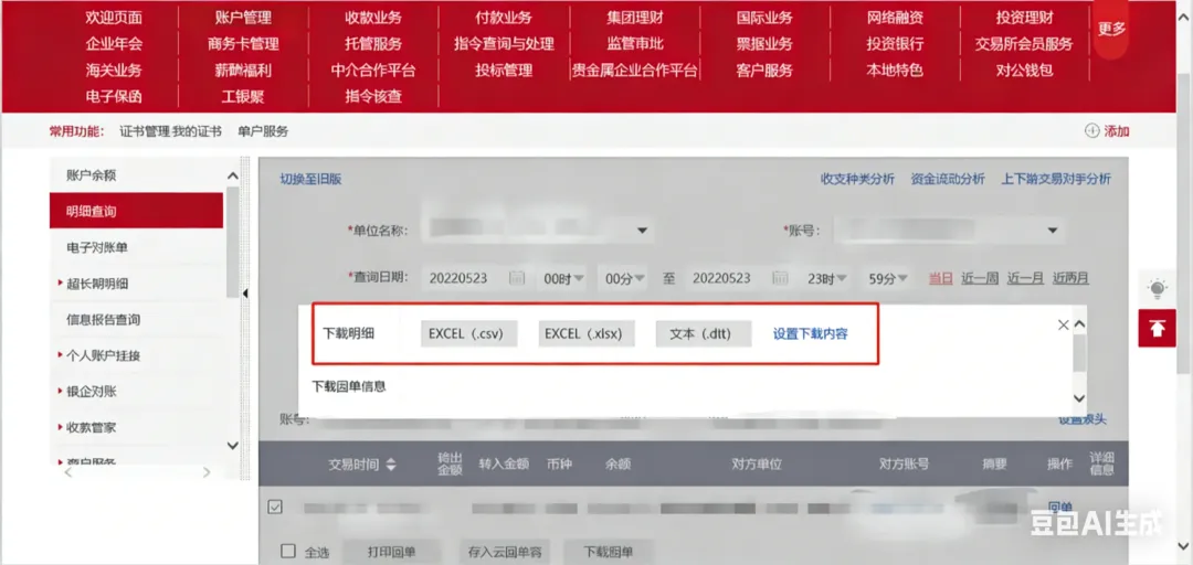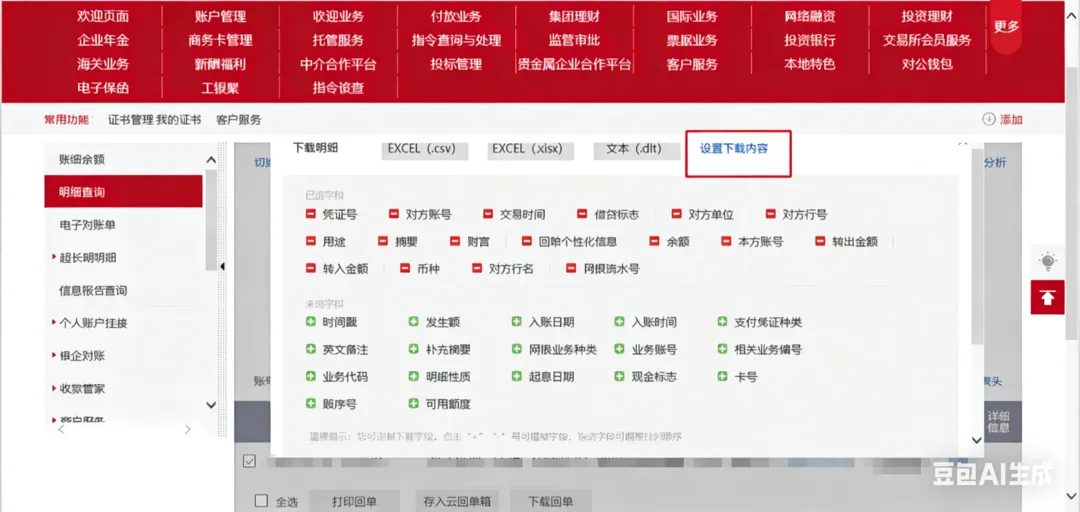 4. 下载中可根据自己的需求增加或者减少自己需要的字段。必选项:对方账号、交易时间、对方单位、用途、摘要、转出金额、转入金额、余额、本方账号、币种、对方行名。