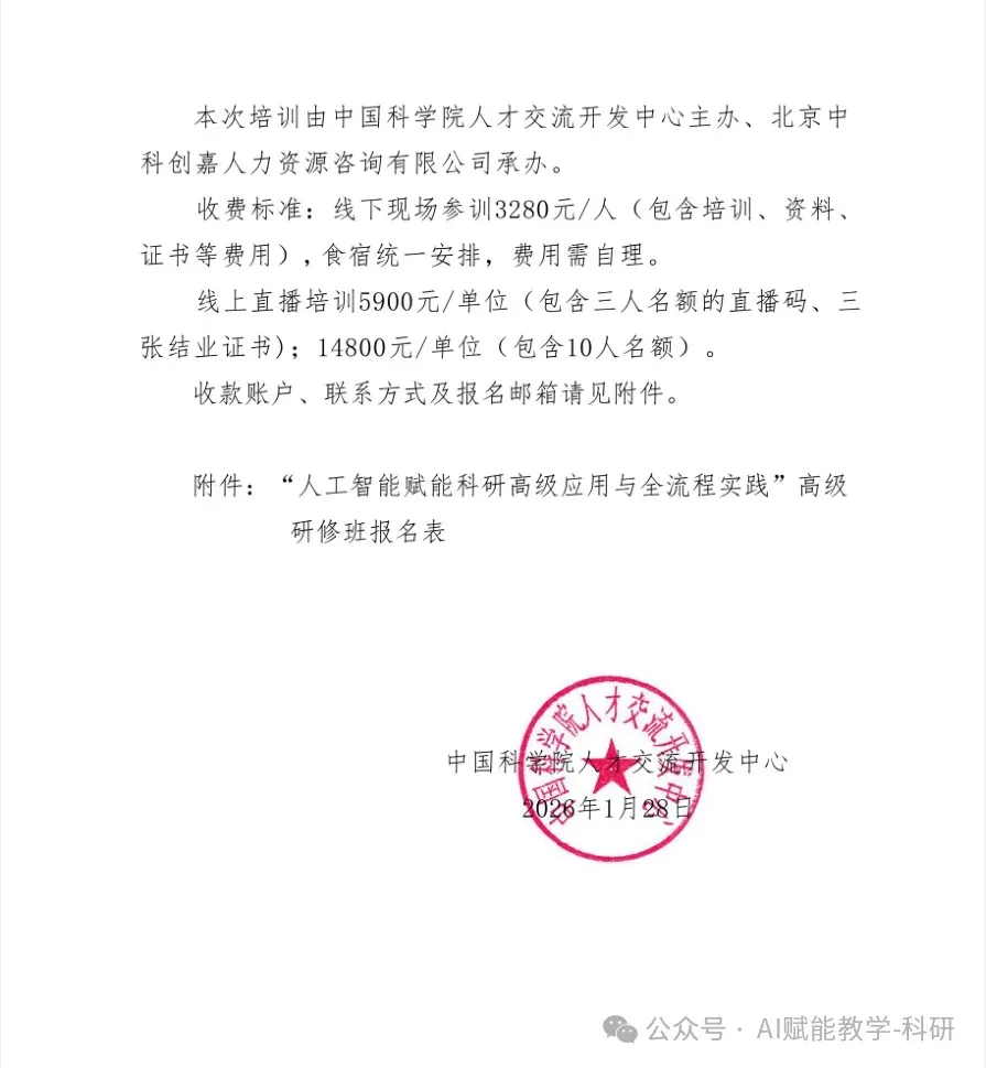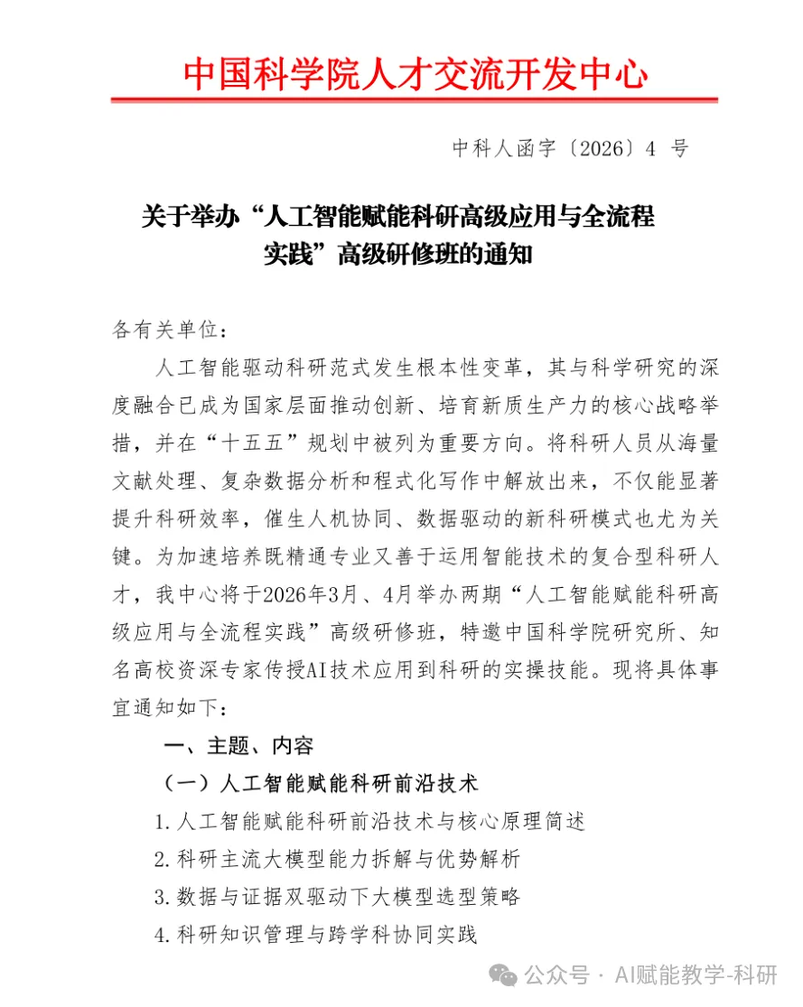 这正是“人工智能赋能科研高级应用与全流程实践”高级研修班旨在解决的核心问题。本次研修由中国科学院人才交流开发中心主办,旨在帮助科研人员系统掌握从文献挖掘到成果发表的AI全栈实战能力。