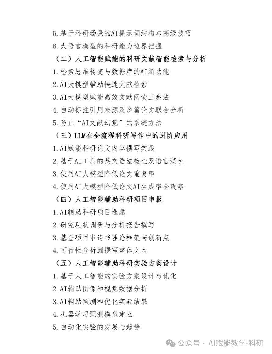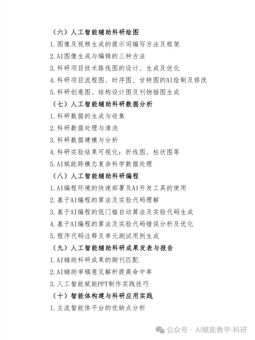 课程不仅覆盖大模型选型、提示词工程、智能体构建等前沿应用,更手把手带您实践:如何用AI高效处理跨模态数据、优化实验方案、一键生成专业图表与代码,乃至构建您专属的、安全可控的“个人AI科研助手”。