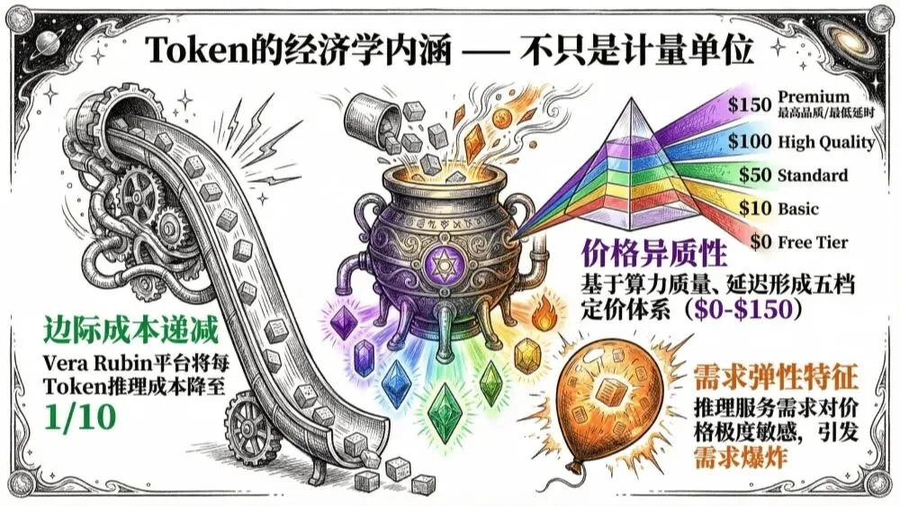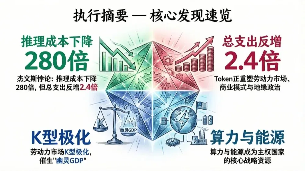 Token经济学全景报告解读(59页附下载)这份题为《Token经济学全景报告:重塑未来的核心生产要素》的报告,构建了一个以“AI算力消耗的Token”为核心分析框架的宏大叙事。其核心论点是:Token已超越简单的计价单位,成为驱动AI时代生产、分配和组织变革的新型核心生产要素。以下是对其核心逻辑与关键论点的解读分析:报告将AI算力市场抽象为一个以Token为基本单位的价值循环系统。这不仅仅是商业模式(如API调用计费)的改变,更是生产关系的重构。Token连接了从硬件制造、基础设施、算力提供、模型平台到应用服务的完整价值链,其流动效率与成本直接决定了经济增长的范式。报告揭示了当前AI经济发展的核心动力与矛盾——杰文斯悖论。即:单位推理成本因技术迭代(如专用芯片、模型优化)而急剧下降(280倍),但由于价格下降激发了大量潜在需求(审批摩擦消失、流程自动化等),导致总支出和总消耗量反而大幅上升(2.4倍)。这使得AI算力市场在规模爆发的同时,陷入了“成本下降但支出攀升”的循环,为企业成本控制和宏观资源分配带来巨大挑战。3. 微观企业层面:从“购买者”到“建设者”的战略重构 转型路径:从购买SaaS(轻资产)、调用API,转向自建“AI工厂”(重资产)。报告指出,当日均Token消耗达百亿级时,自建AI工厂的单位成本可降至SaaS模式的1/5,规模经济效应显著。 新核心竞争力:“每瓦Token吞吐量” 取代了传统算力指标,成为衡量算力效率和生产成本的终极标准,直接驱动了英伟达、Groq等在硬件架构上的竞赛。 市场博弈:推理服务市场出现“逆向选择”(固定费率套餐吸引高用量客户导致亏损)和“纳什均衡价格战”(利润趋近于零),迫使厂商在竞争(Coopetition)中寻求合作,例如共享算力与路由算法。Token对生产力的提升并未普惠所有劳动者,而是导致了深刻的结构性冲击: 劳动力市场K型极化:高技能劳动者借助Token工具提升生产率,获得更高溢价;而中低技能岗位被自动化大规模替代,需求下降。这加剧了收入与机会的不平等。 幽灵GDP现象:虽然AI推动了整体经济增长(报告对比为5.5% vs 传统3.0%),但增长收益大量流向资本(技术所有者、算力提供方),劳动收入份额从60%降至45%,形成“有增长无共享”的“幽灵”繁荣,可能抑制消费与长期宏观稳定。报告将算力置于地缘政治的核心,提出“主权AI”成为国家战略必争之地: 三大特征:算力具备高固定成本、网络效应和边际成本递减的战略资源属性。 大国博弈:美国(技术封锁与领先)、中国(国产替代与自主集群)、欧盟(规则制定与绿色算力)分别采取了不同的主权AI战略。全球供应链正从“效率优先”转向“安全与自主优先”的重构进程。总结:这份报告系统论证了Token经济学如何重塑从企业成本结构、组织管理(如Token薪资)、到劳动力市场、最终至全球地缘政治的完整经济秩序。它指出,我们面临的不仅是一场技术革命,更是一场由算力(Token)这一新生产要素所驱动的、深刻的社会经济范式变革,其带来的效率提升、极化风险与地缘竞争需要技术创新、产业政策与社会保障体系的协同应对。部分内容预览