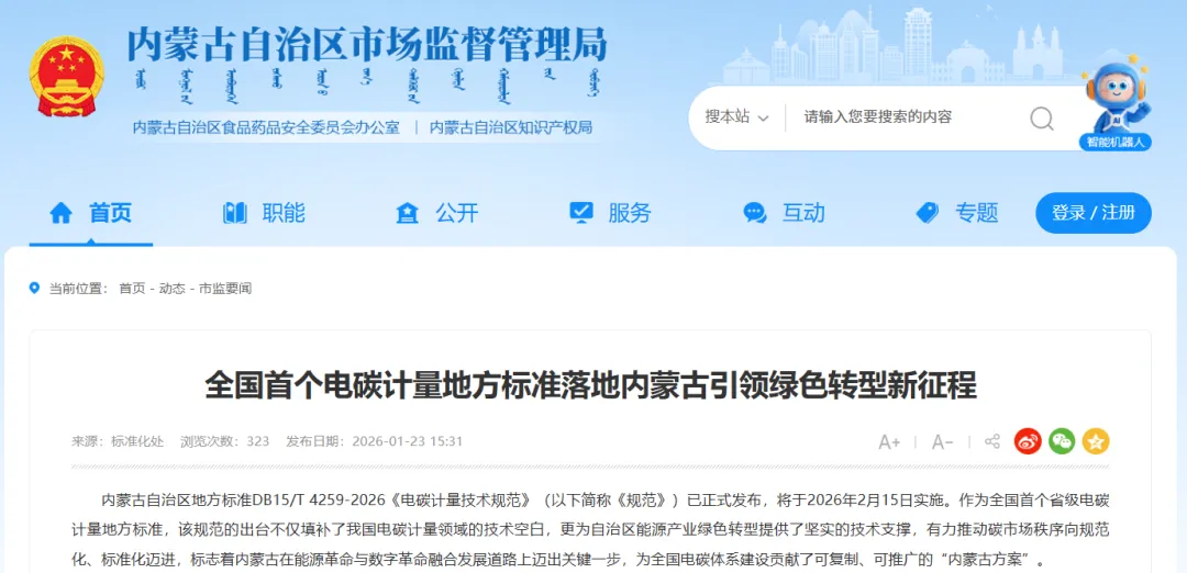 内蒙古地方标准DB15/T 4259-2026《电碳计量技术规范》已正式发布。该标准由内蒙古电力集团联合科研单位历时两年研发完成,并于2026年2月15日实施。该标准整合电力数据采集、碳排放量值传递、计量装置认证等技术,明确发电至用电全环节碳计量方法,建立覆盖煤电、风电、光伏等能源的碳排放因子数据库,填补我国电碳计量领域技术空白。