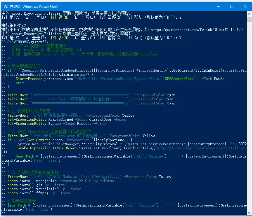 | <# OpenClaw 全自动一键安装脚本 适用:Windows 10 专业版/家庭版 x64 功能:自动安装 Node.js、Git、VC++ 运行库、配置环境、拉取并安装 OpenClaw #> # 强制管理员运行 if (!([Security.Principal.WindowsPrincipal][Security.Principal.WindowsIdentity]::GetCurrent()).IsInRole([Security.Principal.WindowsBuiltInRole]::Administrator)) { Start-Process powershell.exe "-NoProfile -ExecutionPolicy Bypass -File `"$PSCommandPath`"" -Verb RunAs exit } Write-Host "`n=============================================" -ForegroundColor Cyan Write-Host " OpenClaw 一键安装脚本 开始执行 " -ForegroundColor Cyan Write-Host "=============================================`n" -ForegroundColor Cyan # 1. 设置脚本执行权限 Write-Host "[1/6] 配置系统脚本权限..." -ForegroundColor Yellow Set-ExecutionPolicy RemoteSigned -Scope CurrentUser -Force Set-ExecutionPolicy Bypass -Scope Process -Force # 2. 安装 Chocolatey 包管理器(自动装软件) Write-Host "[2/6] 安装 Chocolatey 软件管理器..." -ForegroundColor Yellow if (-not (Get-Command choco -ErrorAction SilentlyContinue)) { [System.Net.ServicePointManager]::SecurityProtocol = [System.Net.ServicePointManager]::SecurityProtocol -bor 3072 Invoke-Expression ((New-Object System.Net.WebClient).DownloadString('https://community.chocolatey.org/install.ps1')) $env:Path = [System.Environment]::GetEnvironmentVariable("Path","Machine") + ";" + [System.Environment]::GetEnvironmentVariable("Path","User") } # 3. 自动安装所有必备依赖 Write-Host "[3/6] 自动安装 Node.js、Git、VC++ 运行库..." -ForegroundColor Yellow choco install nodejs-lts --version=22.0.0 -y --force choco install git -y --force choco install vcredist140 -y --force choco install ffmpeg -y --force # 刷新环境变量 $env:Path = [System.Environment]::GetEnvironmentVariable("Path","Machine") + ";" + [System.Environment]::GetEnvironmentVariable("Path","User") # 4. 验证依赖安装成功 Write-Host "[4/6] 检查依赖版本..." -ForegroundColor Yellow node -v npm -v git --version # 5. 拉取 OpenClaw 源码并安装 Write-Host "[5/6] 下载并安装 OpenClaw..." -ForegroundColor Yellow cd $env:USERPROFILE if (Test-Path "OpenClaw") { Remove-Item "OpenClaw" -Recurse -Force } git clone https://github.com/OpenClaw/OpenClaw.git cd OpenClaw npm install --production # 6. 完成提示 Write-Host "`n=============================================" -ForegroundColor Green Write-Host " ✅ OpenClaw 安装完成! " -ForegroundColor Green Write-Host "=============================================`n" -ForegroundColor Green Write-Host "启动命令:cd $env:USERPROFILE\OpenClaw`n npm start`n" -ForegroundColor White Write-Host "安装路径:$env:USERPROFILE\OpenClaw`n" -ForegroundColor White pause |