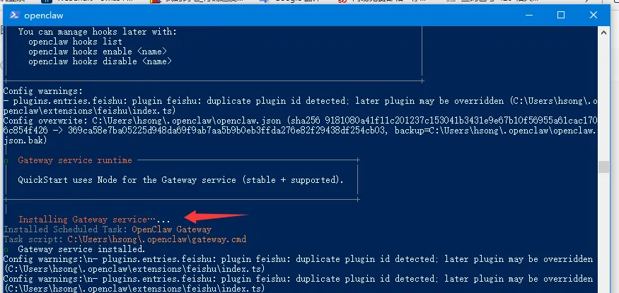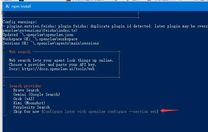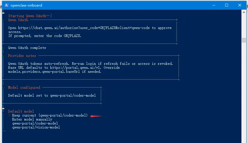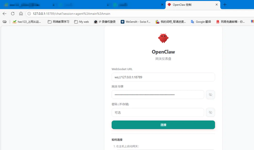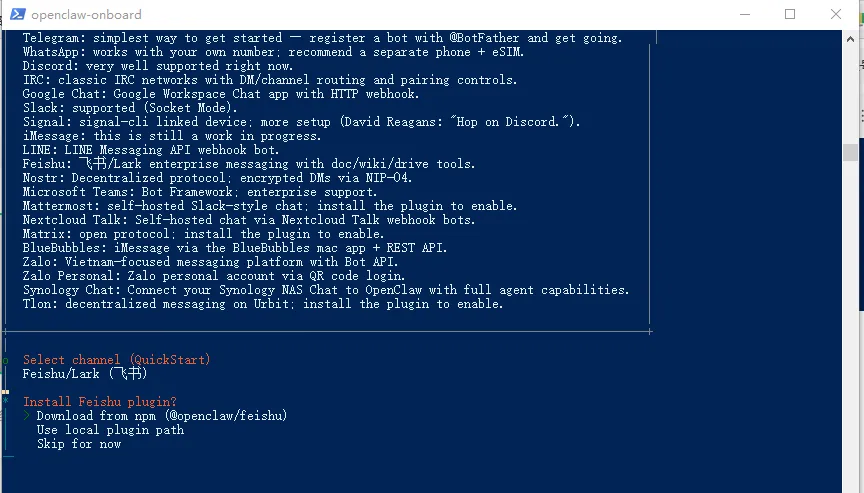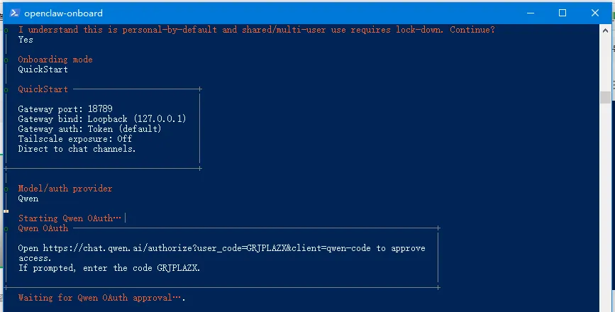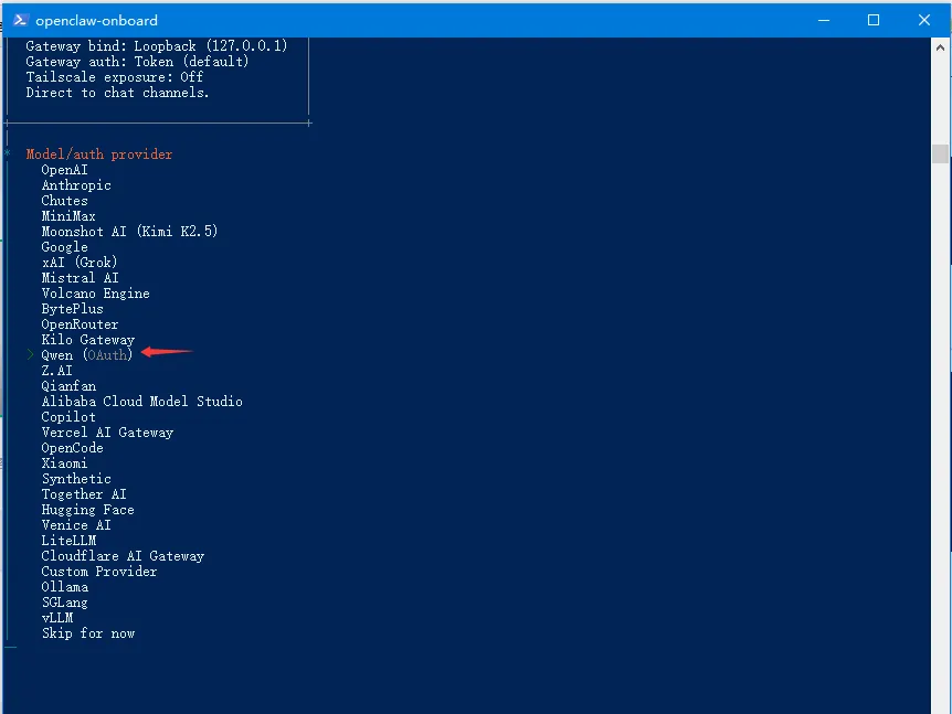 移动上/下箭头选择千问(有免费额度),确认。之后会直接跳转到千问注册页面, 不过我已注册了,点确认即可。确认之后,直接返回操作界面。选择保持现有千问模板, 确认。选择对接与openclaw沟通方法,选择飞书并安装插件。http://127.0.0.1:18789