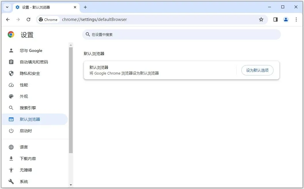 3、将谷歌浏览器设置为默认浏览器,点击浏览器右上角的三个横线标志,再点击左边菜单栏的【设置】,最后点击【将Google chrome 浏览器设置为默认浏览器】。