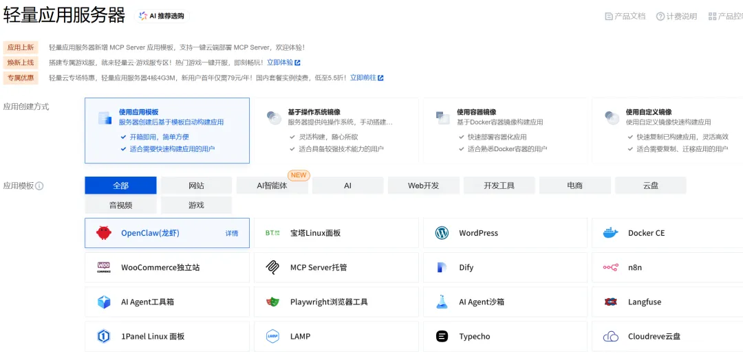 这一步是关键——不要选"系统镜像",要选"应用模板"。在应用模板列表里,找到 OpenClaw(龙虾),直接选中。
