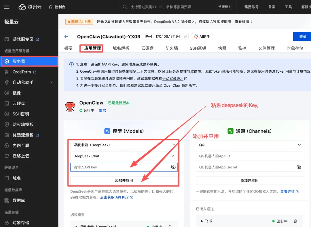 在浏览器中打开小龙虾的后台管理界面,找到算力模型相关的配置入口。选择「DeepSeek」,在 API Key 输入框中,粘贴你刚才保存的那串密钥。