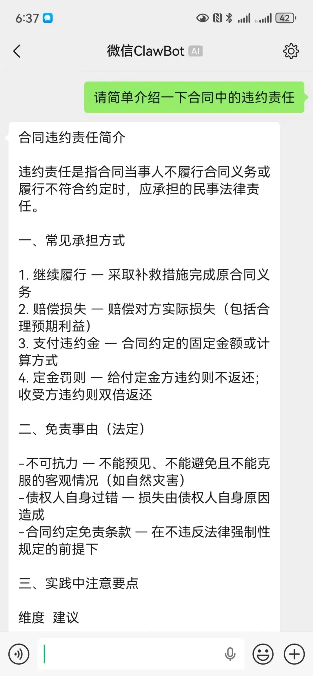 等几秒钟,如果收到一段专业、通顺的回复——🎉 恭喜你,你的AI法务助手已经在微信里上线了!