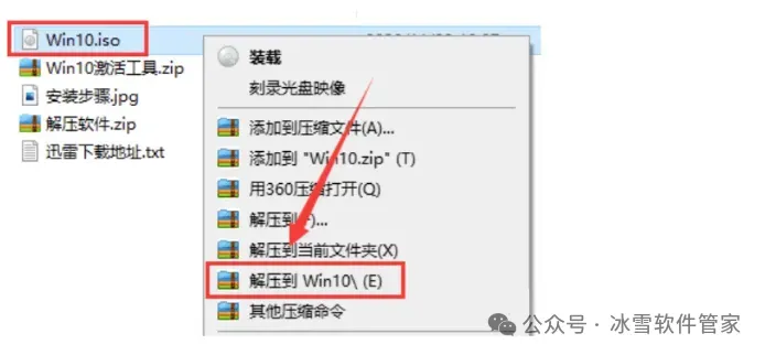 1.将下载的文件夹移动到非C盘位置(如;D盘);打开下载的文件夹,选中【Win10.iso】镜像文件,鼠标右击选择【解压到Win10】。