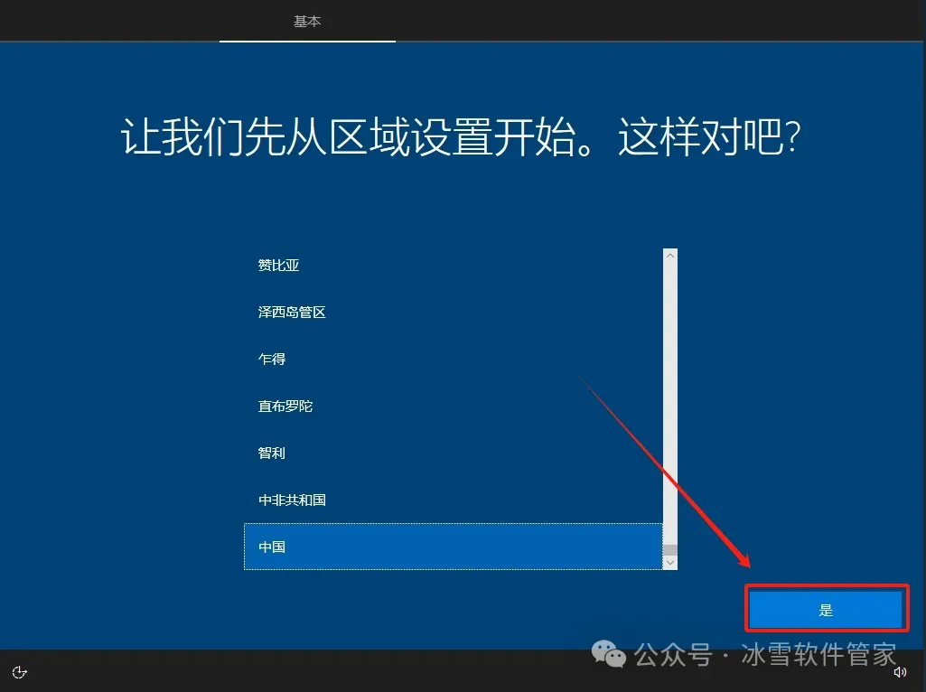 11.区域设置,选择【中国】,然后点击【是】。