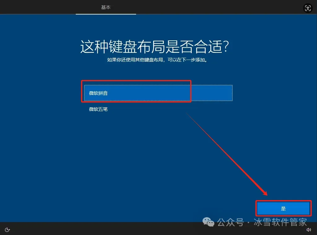 12.输入法选择【微软拼音】,然后点击【是】。