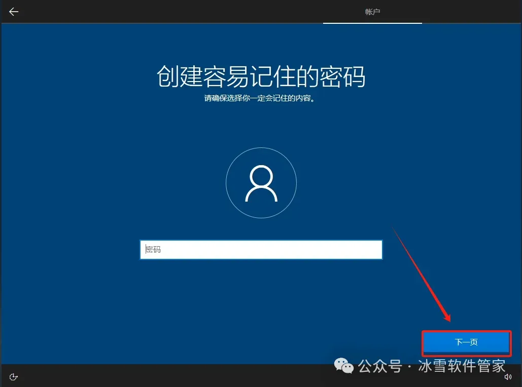 17.设置账户密码(电脑开机时需要此密码),如果不需要,直接点击【下一步】跳过。
