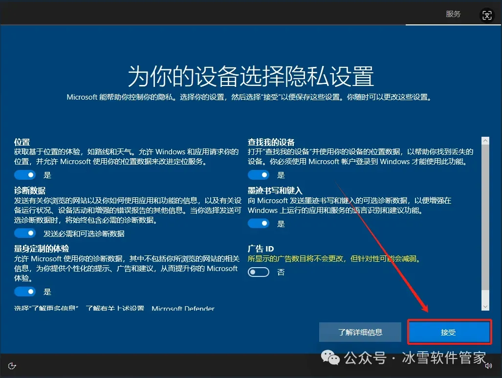 18.隐私设置,保持默认(也可以关闭相关广告),然后点击【接受】。