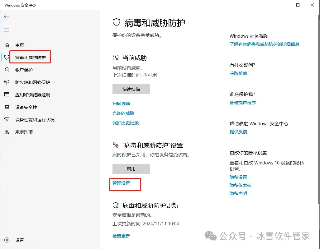 2)点击病毒和威胁防护--管理设置--关闭实时防护