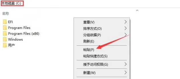 6.在C盘根目录空白处右键粘贴(ProgramData文件夹默认是隐藏的)。