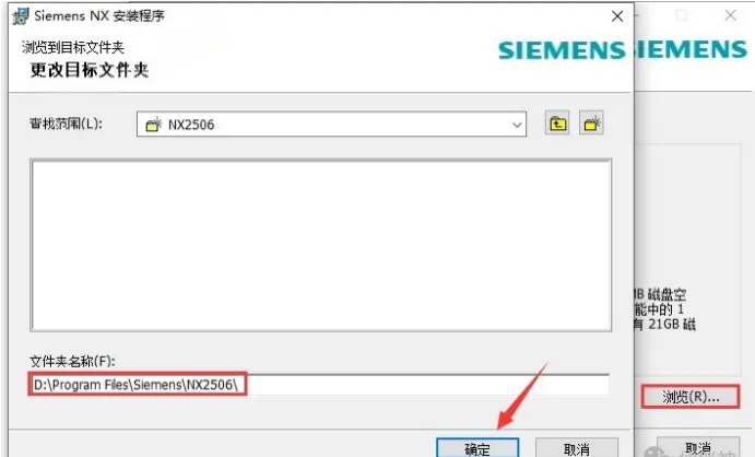 16.点击浏览,修改路径地址中的首字符C可更改安装位置,本例安装到D盘,点击确定。