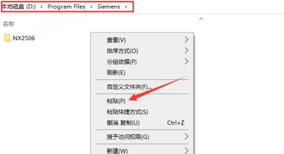 24.打开图示路径D:\Program Files\Siemens(第16步设置的路径),在空白处右键粘贴。