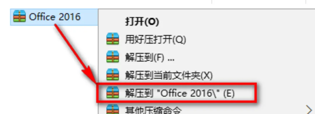 下载完成后,鼠标右键点击压缩包,选择“解压到 office 2016”。