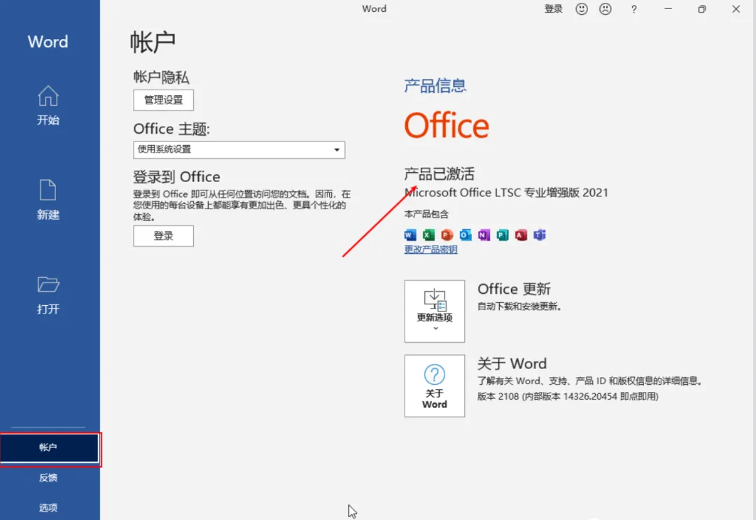 打开任意Office组件(如Word),点击左上角的 “账户”,在产品信息中可以看到 “激活的产品” 字样,说明已经永久激活成功!