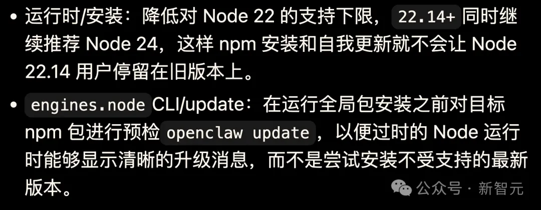 此前 Node 22.14 的用户在升级时会遇到版本不兼容导致安装失败的问题,这次也把版本检测提前了,跑 openclaw update 之前会先检查你的 Node 版本够不够,不够会直接告诉你需要升级,而不是安装到一半失败、留下一堆让人摸不着头脑的报错。