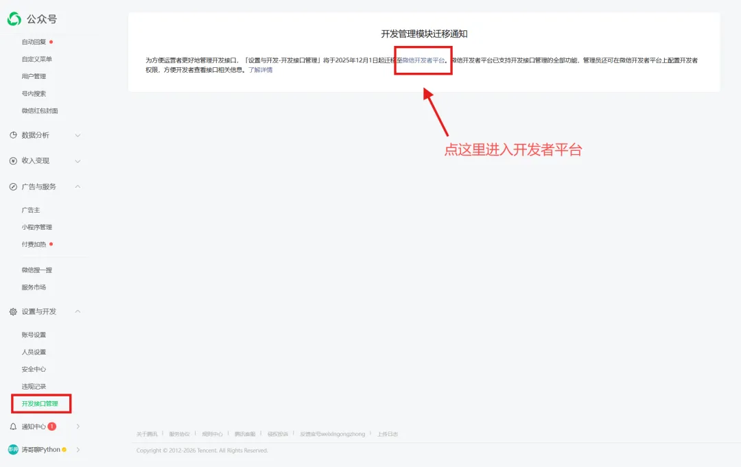 登录 mp.weixin.qq.com → 开发接口管理 → 前往控制台