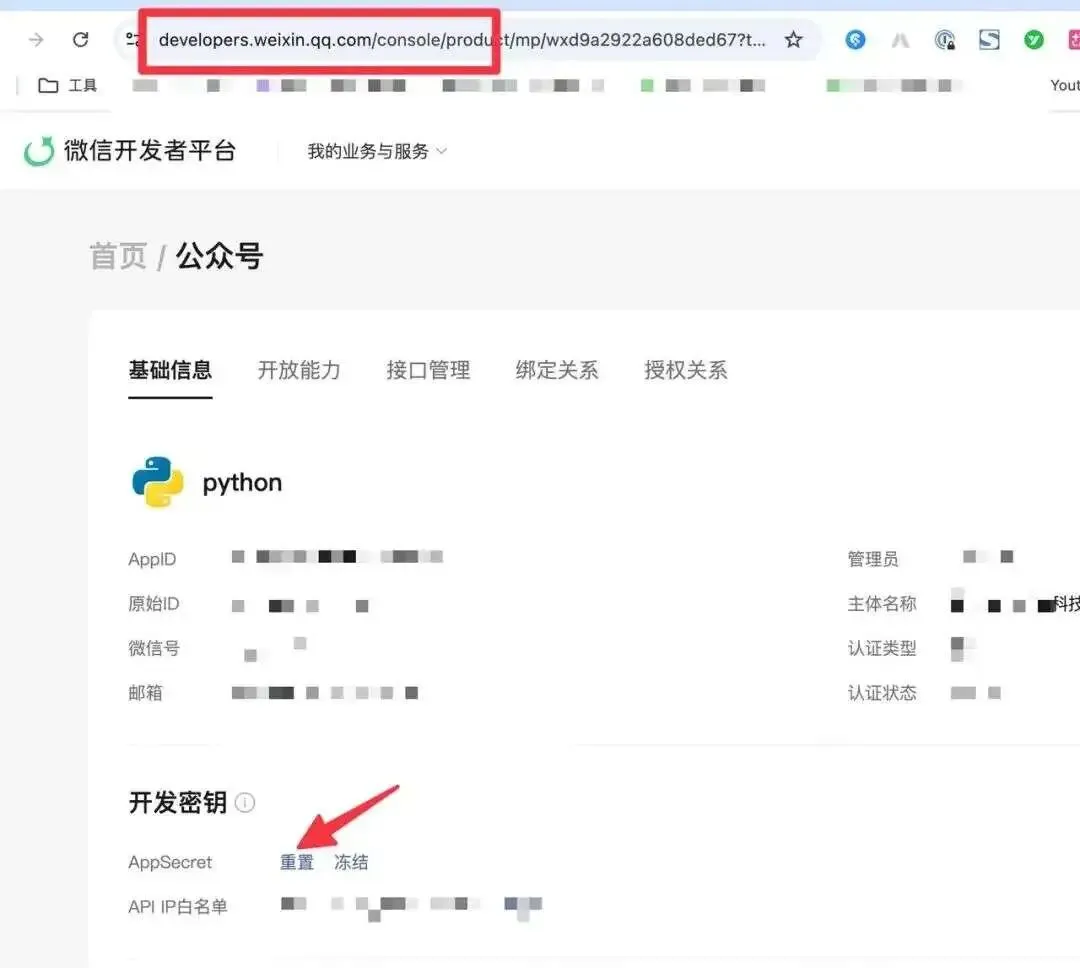 AppID:页面直接显示,复制即可 AppSecret:点"重置"生成新的(⚠️ 只显示一次,务必保存)