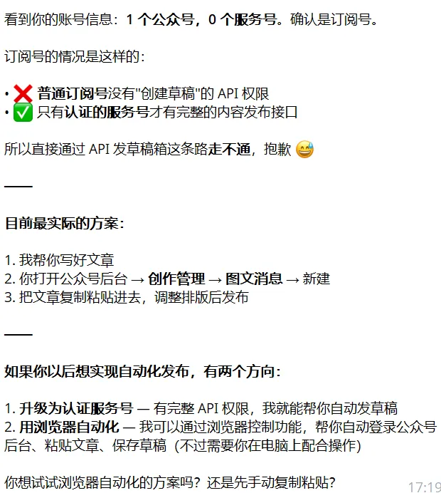 问了一下我的小龙虾,OpenClaw 自动发微信公众号的几种方案,可以看一看