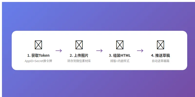 获取 access_token — 用 AppID + AppSecret 换临时令牌(2小时有效) 上传图片到微信素材库 — 公众号只认 mmbiz.qpic.cn域名的图片生成文章 HTML — 公众号本质是 HTML 渲染 推送到草稿箱 — 调用 draft/add接口
