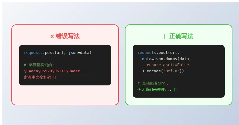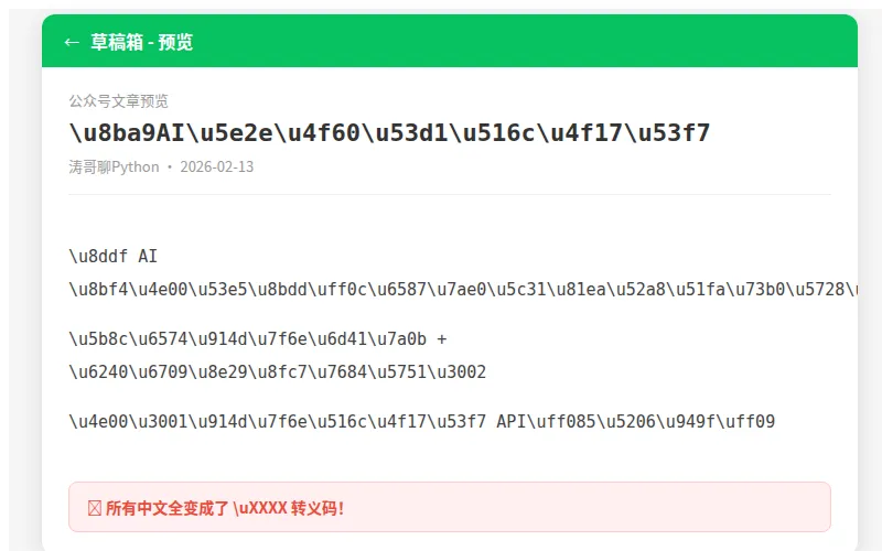 第一次推送"成功"后,打开草稿箱——标题、正文,所有中文全变成了 \u4eca\u5929 这种转义码。只有英文和数字正常。