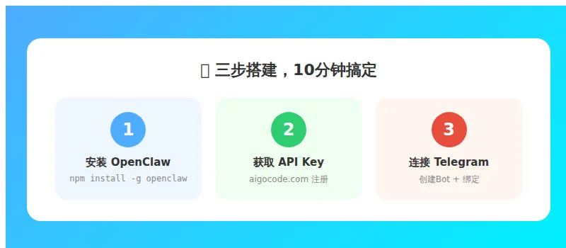 1. npm install -g openclaw && openclaw onboard2. 去 aigocode.com 注册拿 API Key3. 连接 Telegram bot4. 告诉 AI 公众号 AppID 和 AppSecret