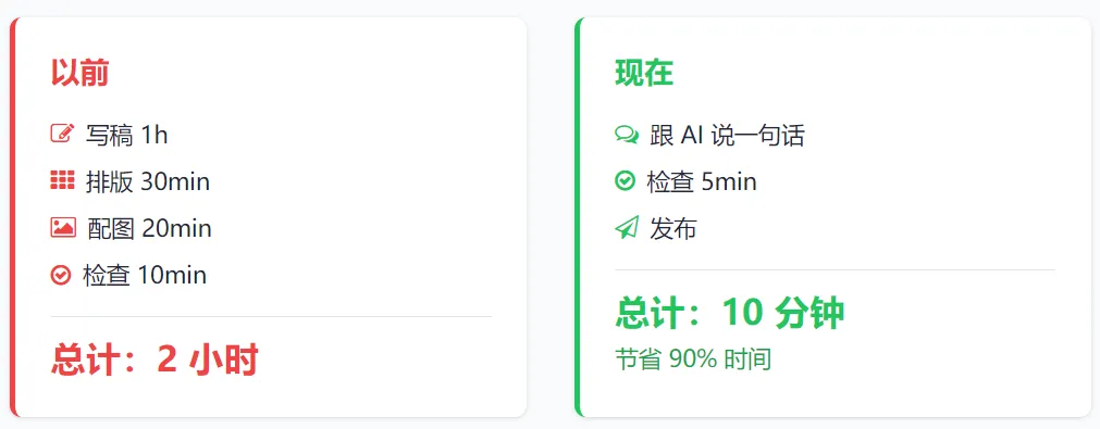 以前: 写稿 1h + 排版 30min + 配图 20min + 检查 10min = 2 小时