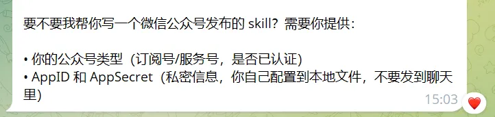 写一个 skill,封装微信公众号 API 调用 在 HEARTBEAT.md 里加定时任务,比如每天生成内容 → 调 skill 发布 内容可以复用你现在的推特热点任务——同一批素材,推特发短文案,公众号发长文