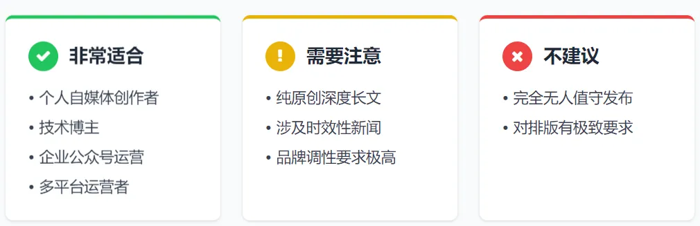 个人自媒体创作者,想提高出稿效率 技术博主,日常积累素材多但没时间整理 企业公众号运营,需要稳定的内容产出 多平台运营者,一篇内容需要分发多个平台