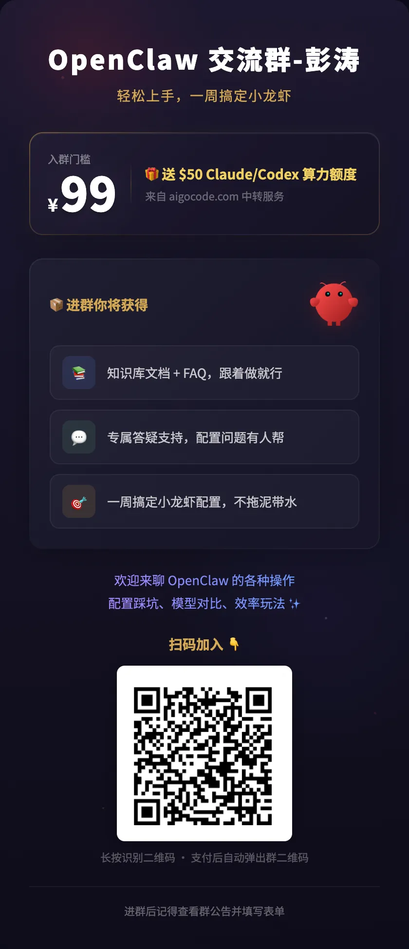 如果你对 OpenClaw 感兴趣,或者在实践中遇到问题,欢迎加入 OpenClaw 中文交流群。 99 元入群,送 $50 aigocode.com 算力额度。群里都是实际在用 OpenClaw 的玩家,每天分享使用技巧和踩坑经验,氛围很活跃。