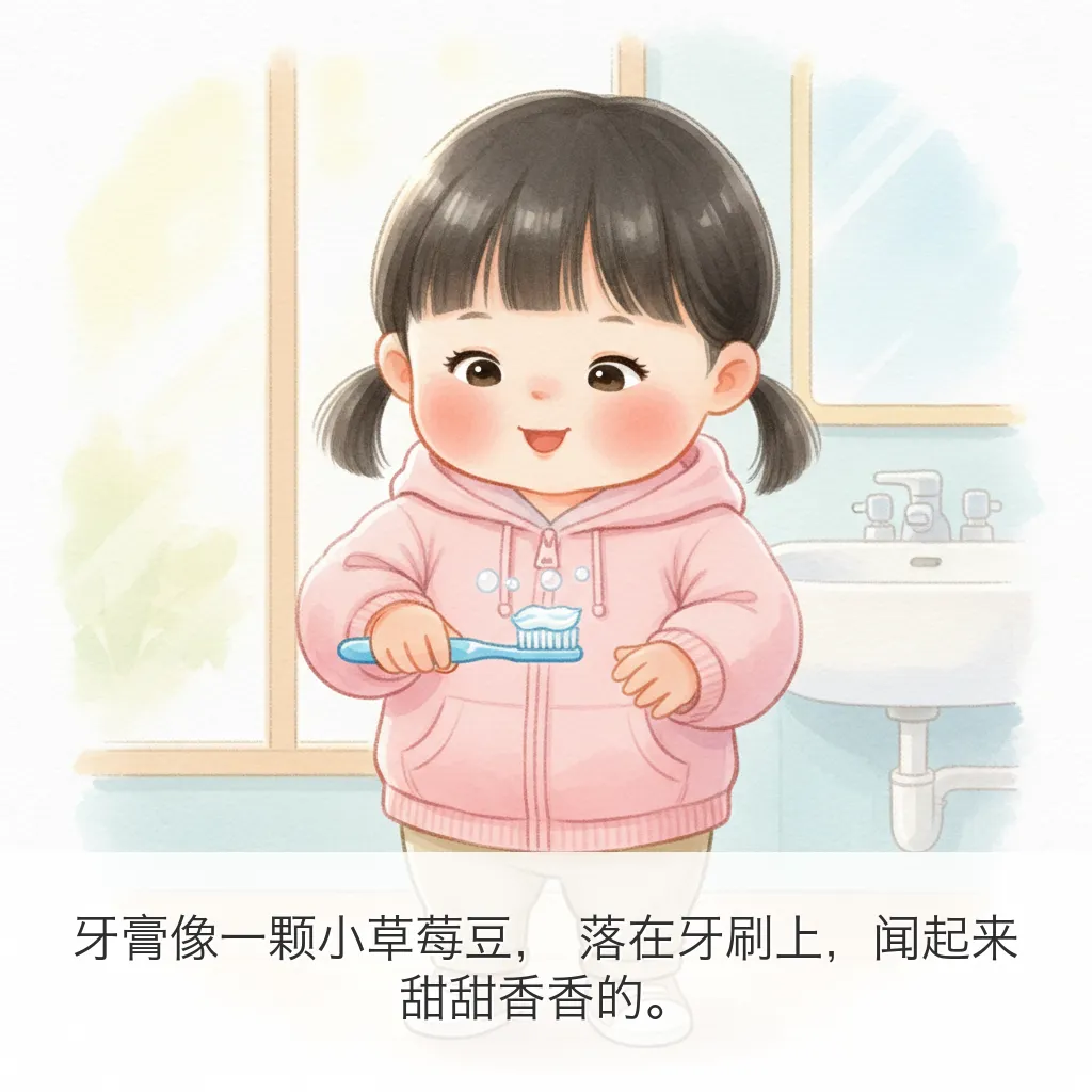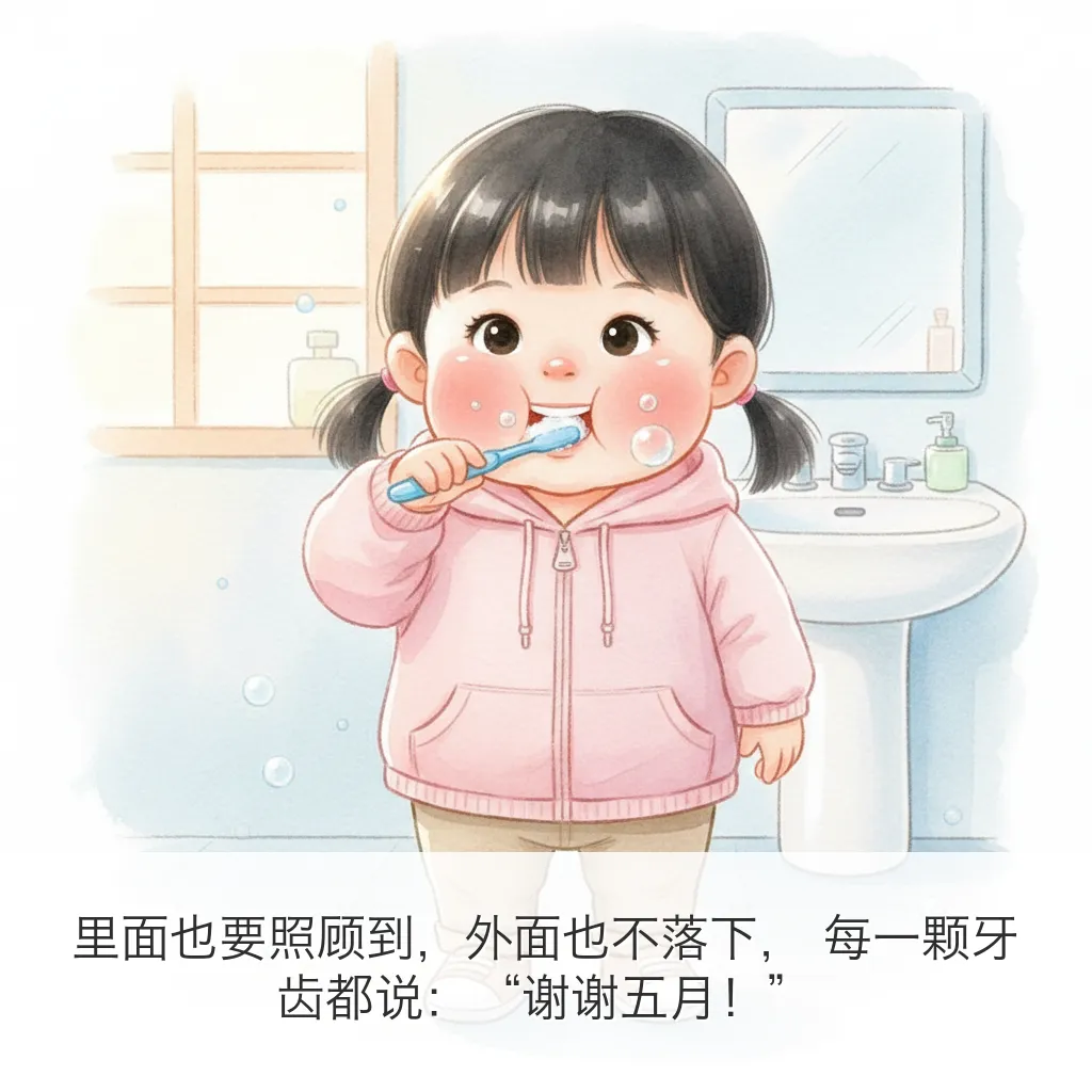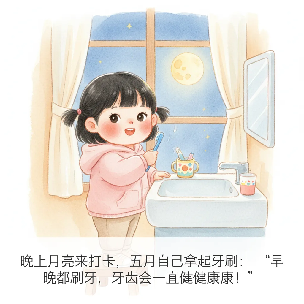 用 OpenClaw 给五月做了一本 9 页小绘本:《今天要刷牙!》。这次主题很实用:把“刷牙”这件小事,变成一个有趣、可执行、能形成习惯的小冒险。---## 绘本正文(按页)### 第1页太阳公公爬上窗台,悄悄说:“五月,牙齿小卫士要集合啦!”### 第2页五月抿了抿嘴巴,小声问:“可是牙刷毛毛的,会不会不舒服呀?”### 第3页这时,小黄牙刷跳出来说:“别怕别怕,我们是你的刷牙搭档!”### 第4页牙膏像一颗小草莓豆,落在牙刷上,闻起来甜甜香香的。### 第5页刷一刷,上面的小牙齿;转一转,像给牙齿跳圆圈舞。### 第6页里面也要照顾到,外面也不落下,每一颗牙齿都说:“谢谢五月!”### 第7页咕噜咕噜,泡泡坐滑梯,“哗啦”一下,全都滑走啦!### 第8页镜子里的五月笑得亮晶晶,原来刷牙之后,笑容也会发光。### 第9页晚上月亮来打卡,五月自己拿起牙刷:“早晚都刷牙,牙齿会一直健健康康!”---## 这本绘本想传达的核心- 刷牙不是“被要求”,而是“我能做到”- 把步骤可视化,降低孩子抗拒- 用情绪鼓励代替说教---## 英文小诗(Poem Excerpt)Brush, brush, little teethBrush them clean and brush beneath.Up and down, and round we go,Tiny bubbles, row by row.Rinse, rinse, sparkling bright,Morning sun and moon at night.When I smile, my teeth will say:“Thank you, May, for today!”