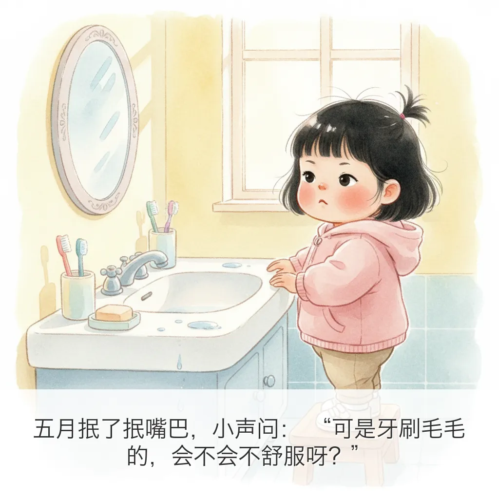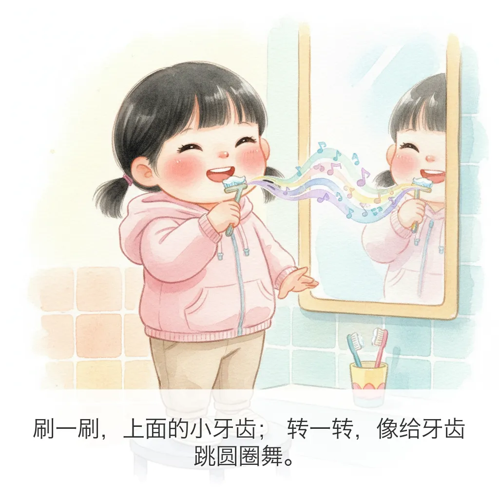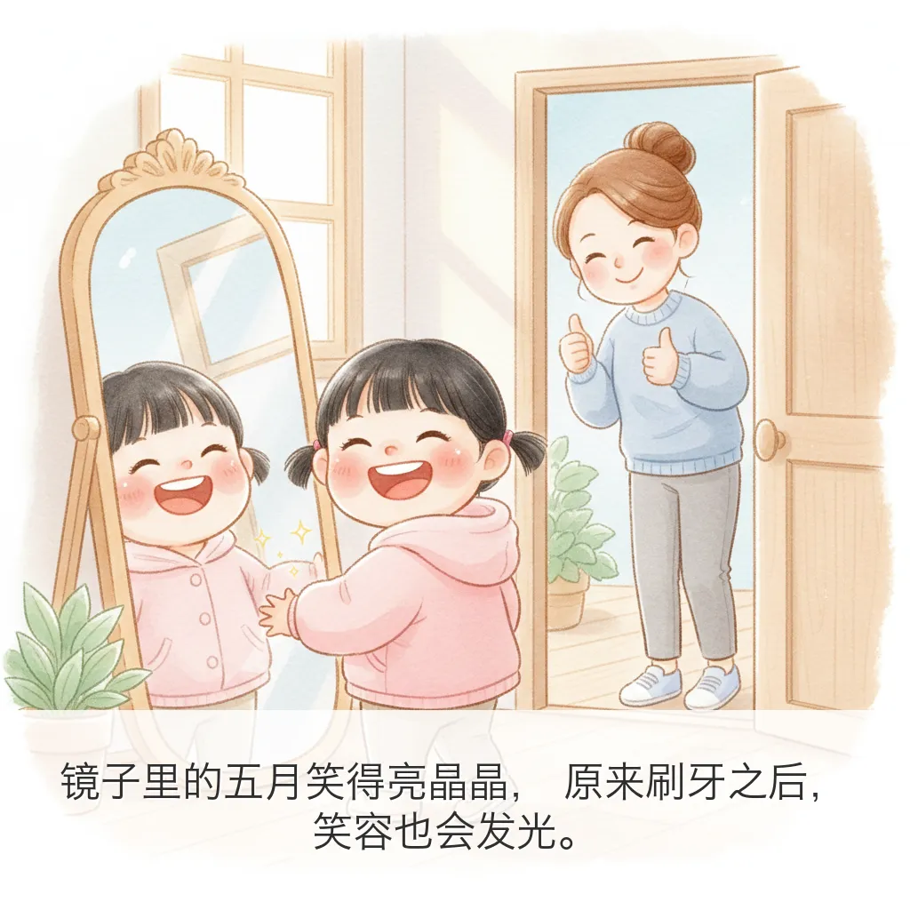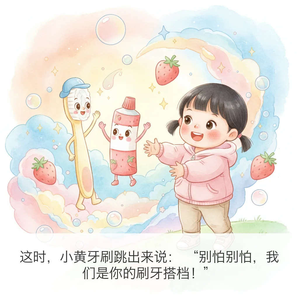 用 OpenClaw 给五月做了一本 9 页小绘本:《今天要刷牙!》。这次主题很实用:把“刷牙”这件小事,变成一个有趣、可执行、能形成习惯的小冒险。---## 绘本正文(按页)### 第1页太阳公公爬上窗台,悄悄说:“五月,牙齿小卫士要集合啦!”### 第2页五月抿了抿嘴巴,小声问:“可是牙刷毛毛的,会不会不舒服呀?”### 第3页这时,小黄牙刷跳出来说:“别怕别怕,我们是你的刷牙搭档!”### 第4页牙膏像一颗小草莓豆,落在牙刷上,闻起来甜甜香香的。### 第5页刷一刷,上面的小牙齿;转一转,像给牙齿跳圆圈舞。### 第6页里面也要照顾到,外面也不落下,每一颗牙齿都说:“谢谢五月!”### 第7页咕噜咕噜,泡泡坐滑梯,“哗啦”一下,全都滑走啦!### 第8页镜子里的五月笑得亮晶晶,原来刷牙之后,笑容也会发光。### 第9页晚上月亮来打卡,五月自己拿起牙刷:“早晚都刷牙,牙齿会一直健健康康!”---## 这本绘本想传达的核心- 刷牙不是“被要求”,而是“我能做到”- 把步骤可视化,降低孩子抗拒- 用情绪鼓励代替说教---## 英文小诗(Poem Excerpt)Brush, brush, little teethBrush them clean and brush beneath.Up and down, and round we go,Tiny bubbles, row by row.Rinse, rinse, sparkling bright,Morning sun and moon at night.When I smile, my teeth will say:“Thank you, May, for today!”