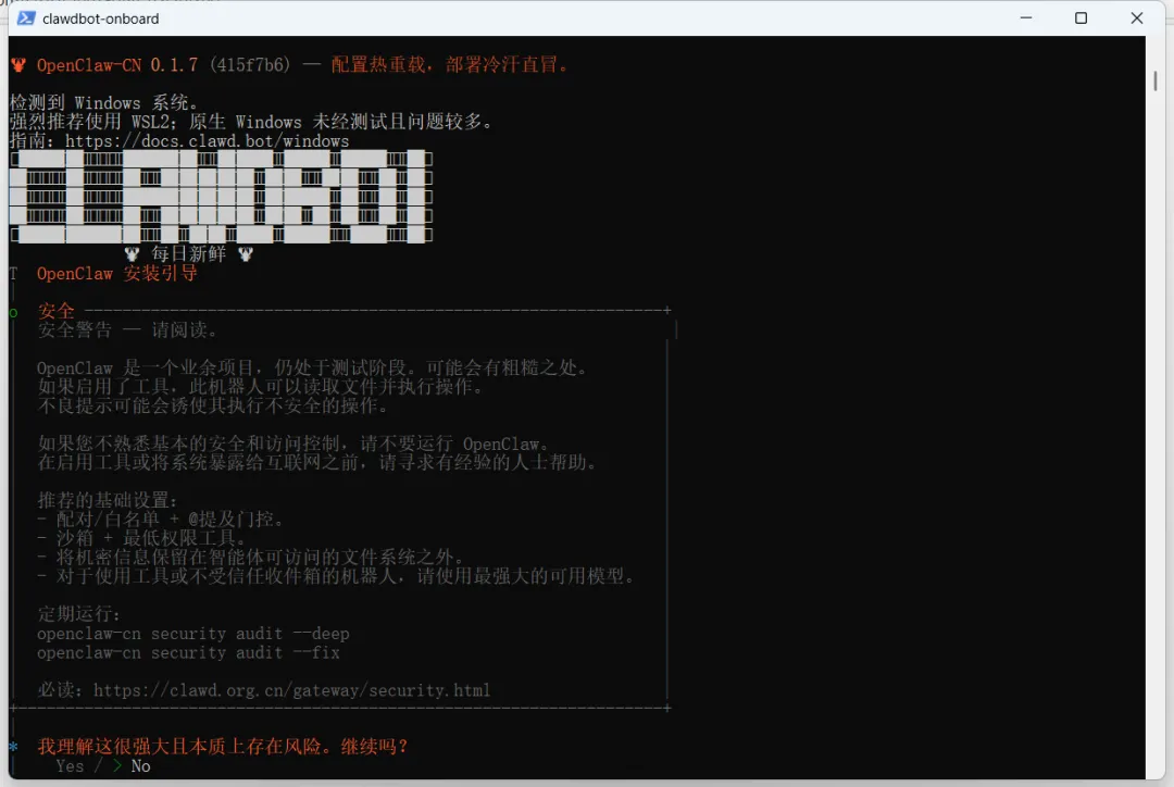 进行初始化配置:openclaw-cn onboard --install-daemon