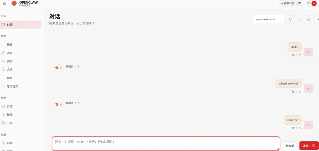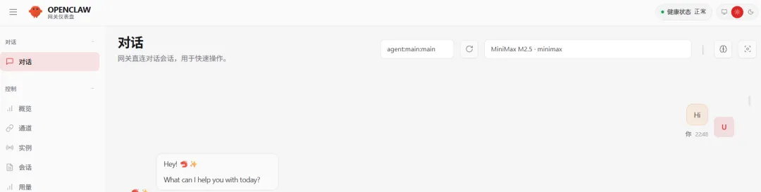 好吧,重新配置一遍,除了MiniMax,其他一概不要。再试一次——嘿,这次对话框终于有动静了!小龙虾"活"过来了!