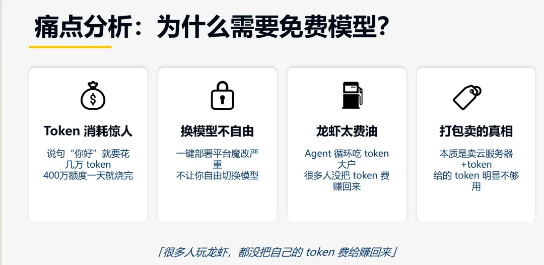 养龙虾,token 是粮食,模型是发动机。用免费模型不是为了省钱而省钱,而是用最低成本验证需求、锁定场景,再决定要不要换更好的发动机。