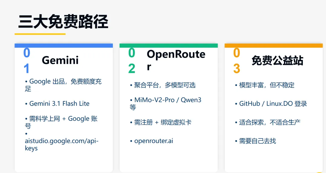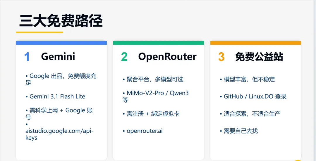 三条路子各有取舍:Gemini 需要翻墙但稳定、OpenRouter 需要虚拟卡但选择多、公益站免费但随时可能挂。如果都不想折腾,花个几十块搞个顶级套餐,反而最省心。