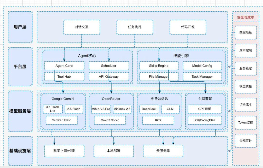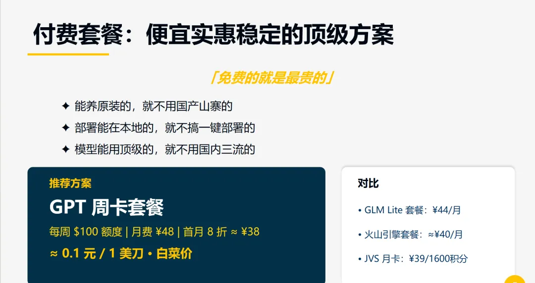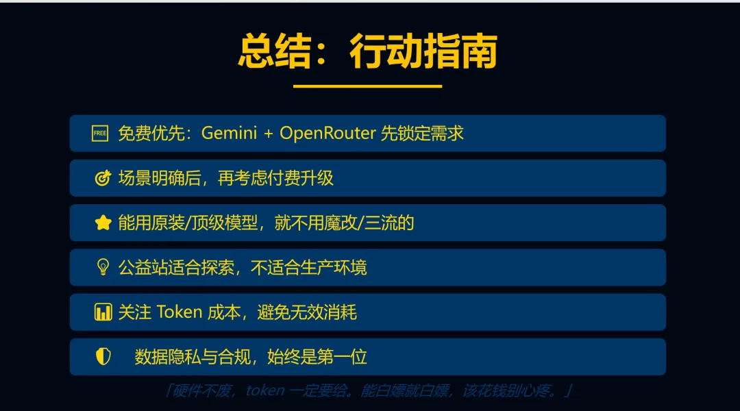 1. 免费优先,探索价值:初期可通过免费模型进行需求验证与原型开发,降低试错成本。 2. 理性付费,长远考量:当需求明确、需要稳定可靠的方案时,我们应选择性价比高、模型顶级且服务稳定的付费套餐,避免被“一键部署”的看似低门槛所误导,其潜在的 token 消耗与有限的模型配置可能导致得不偿失。 3. 稳定压倒一切:核心业务逻辑与生产环境,务必建立在可靠、可控的基石之上。