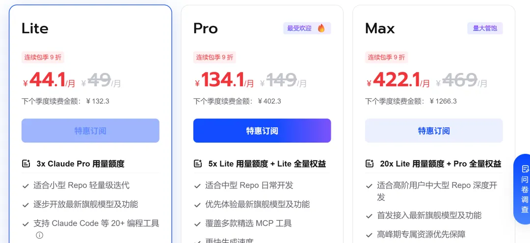 比起国产GLM的lite套餐也都要44一个月了,其他火山引擎的套餐,也都涨价差不多40元一个月都
