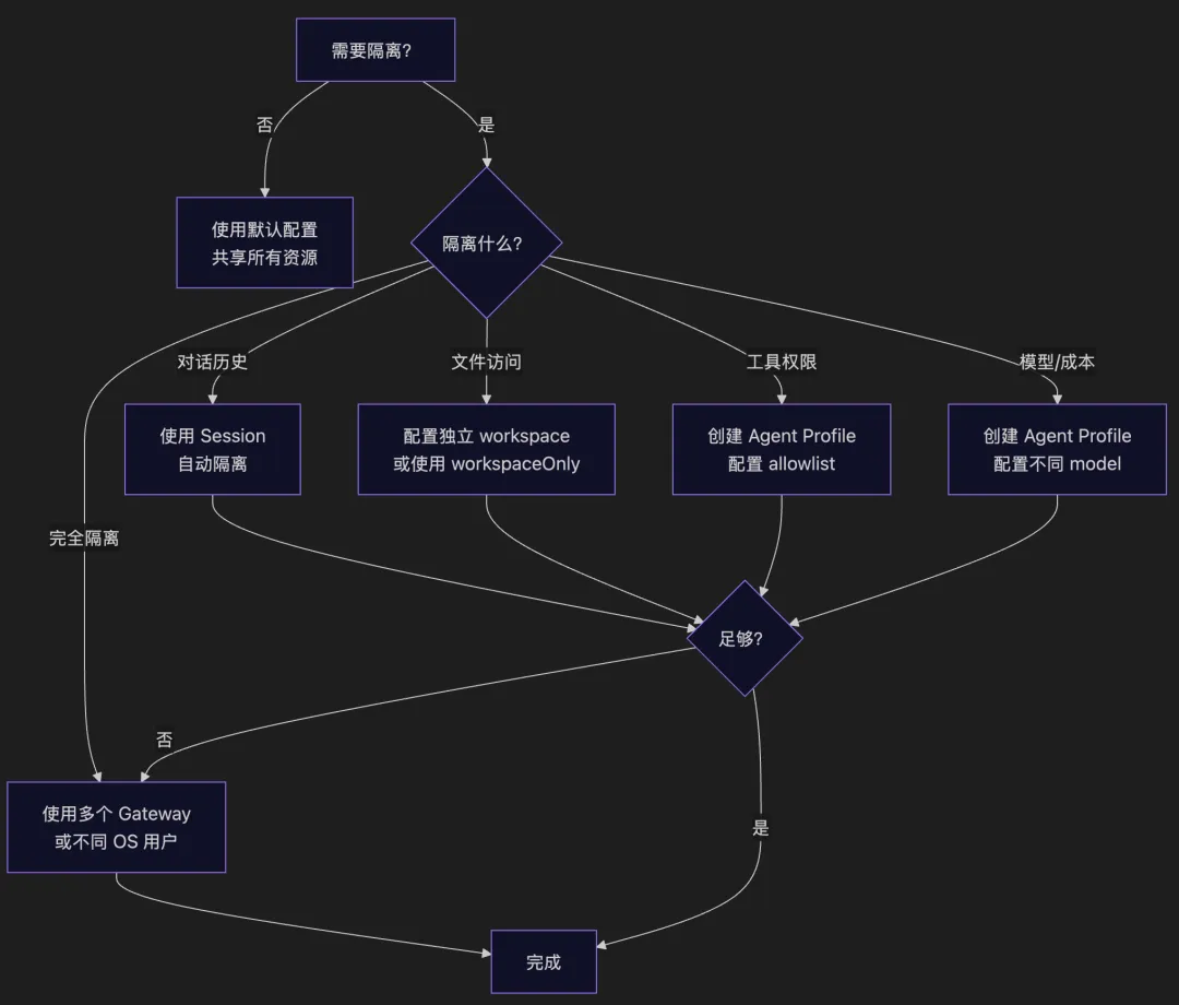 多用户访问同一 workspace? → 考虑独立 workspace 需要限制 API 调用成本? → 为轻量任务配置便宜模型 敏感操作? → 配置 tools denylist 完全隔离需求? → 考虑多个 Gateway 实例