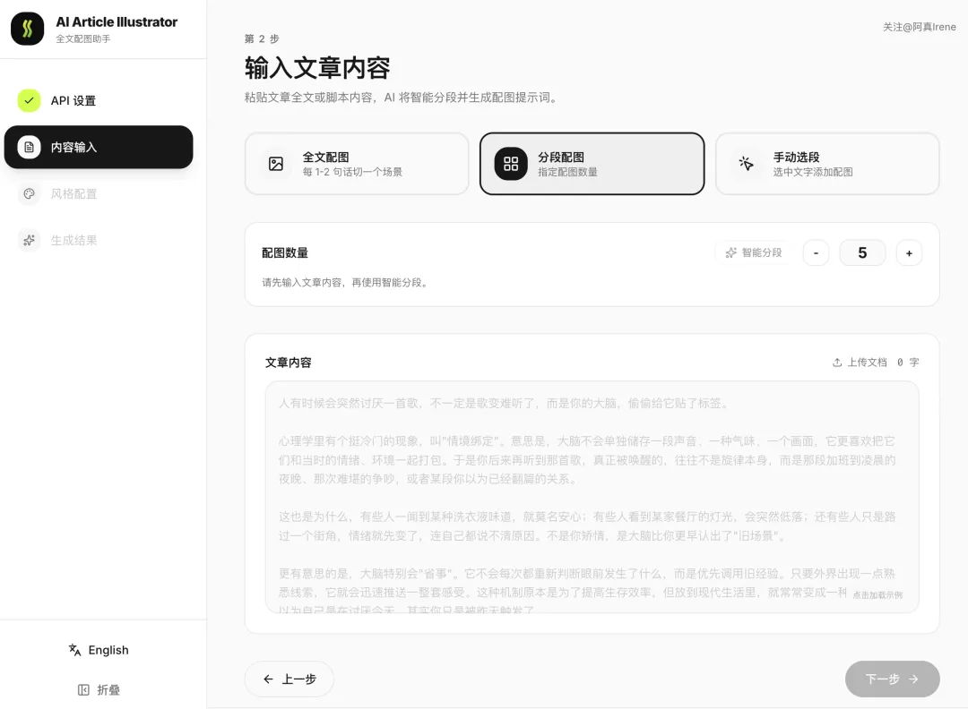 https://github.com/irenerachel/ai-article-illustrator.git功能:粘贴文章内容,自动分段并生成配图提示词和图片。