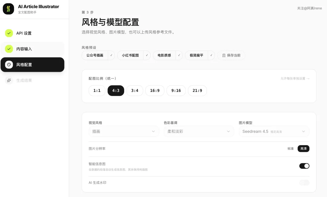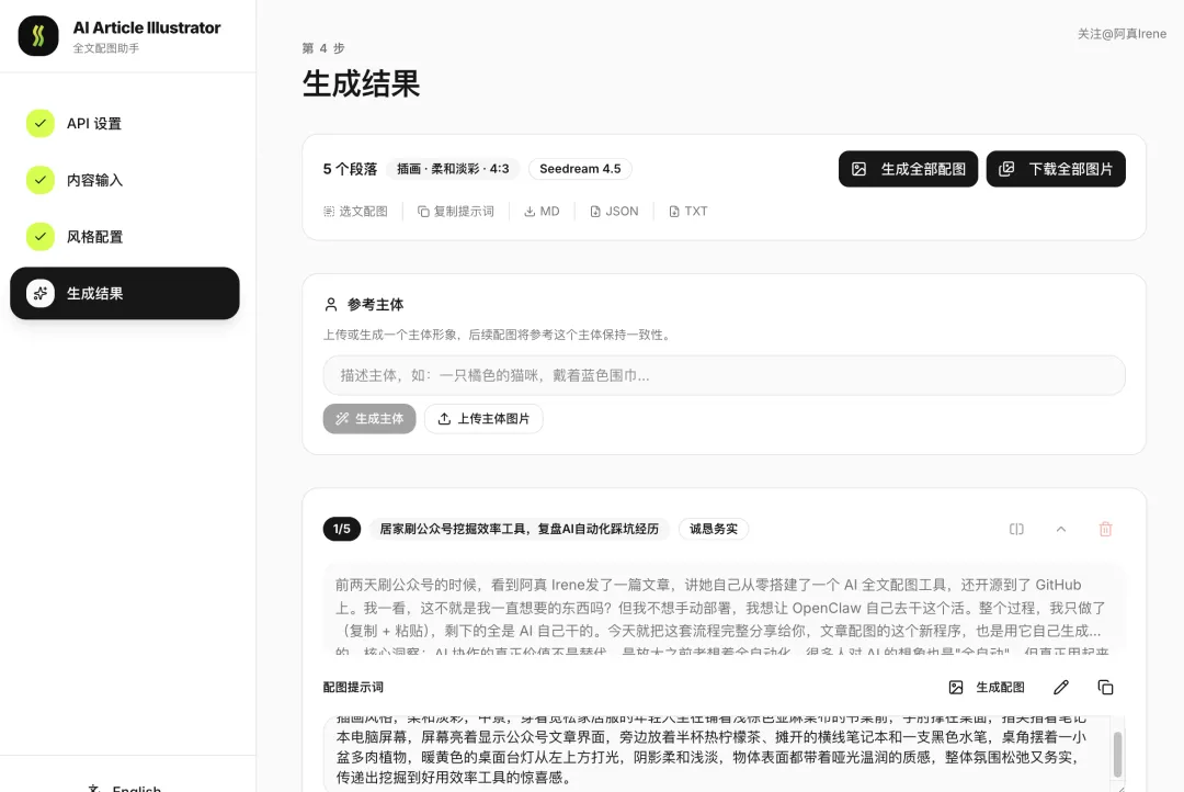 前两天刷公众号的时候,看到阿真 Irene发了一篇文章,讲她自己从零搭建了一个 AI 全文配图工具,还开源到了 GitHub 上。
