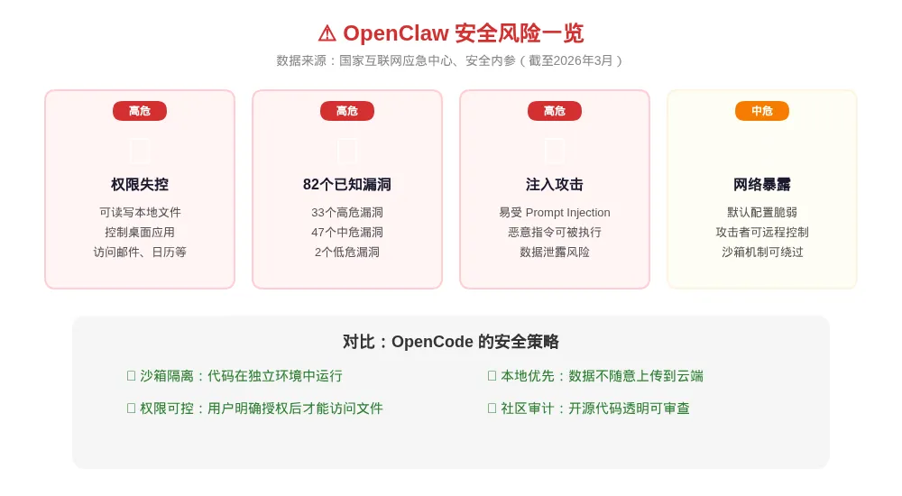 国家互联网应急中心已经为此发布了专项安全预警。截至2026年3月,OpenClaw 已被披露 82个安全漏洞,其中33个高危。更关键的是,它容易受到 Prompt Injection(提示注入)攻击,恶意指令可能通过看似正常的文档被执行。