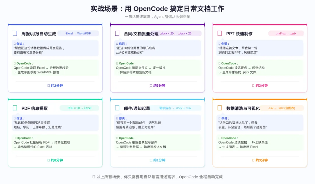 这些场景的共同点是:你只需要用自然语言描述需求,OpenCode 全程自动完成。 不需要学 VBA 宏,不需要记 Excel 函数,不需要研究 PPT 模板——Agent 时代的生产力,就是这么朴素。