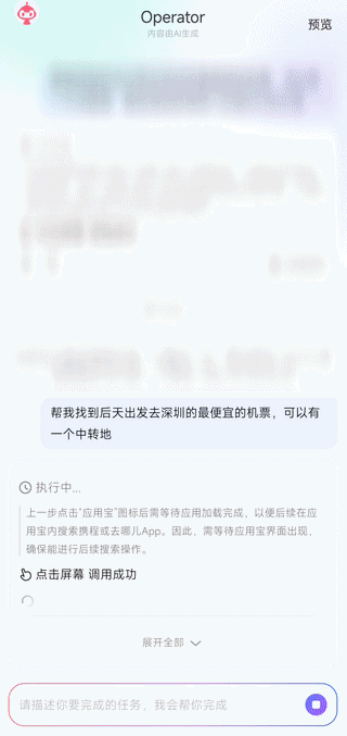 安装携程APP、筛选航班、多方案比价、下单,一套流程行云流水。在涉及敏感信息的关键节点,例如同意协议、登录、输入密码,Operator会把云手机给我接管,让我亲自操作。着实安心了不少。