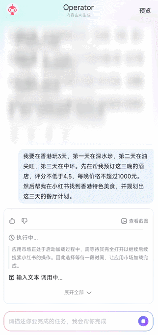 下面来个复杂的,告诉Operator我在香港游玩的路线(深水埗-油尖旺-中环),让它帮我根据小红书的推荐规划特色餐厅,以及订酒店(评分不低于4.5,每晚价格不超过1000元)。