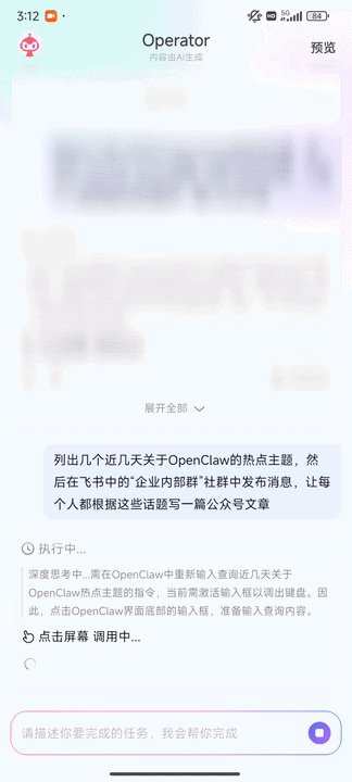 我们不仅能看到Operator的思考过程,也能点击右上角的预览,实时观看云手机界面。可以看到Operator在OpenClaw中获取到了几个热点,然后成功进入飞书发送了群消息。